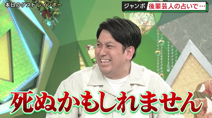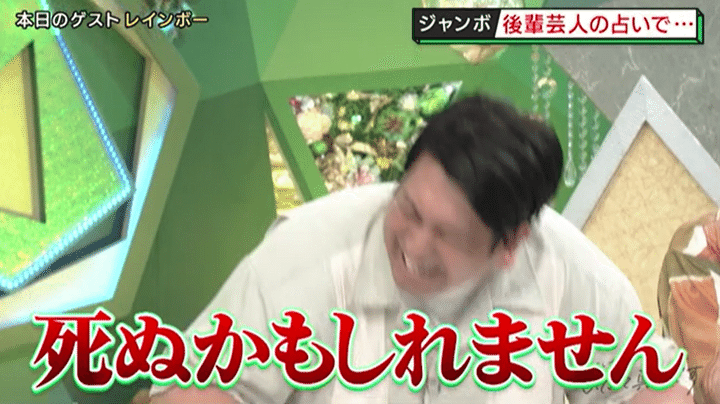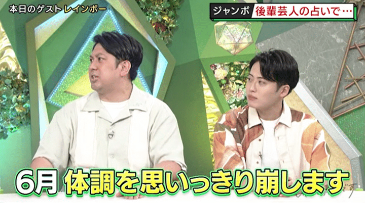 ゲストのジャンボたかお (レインボー)は、「芸能界中で死ぬほど当たると噂になっている」という後輩の占い芸人・金城めくるくんの占いエピソードを披露。金城めくるくんの占いによると、ジャンボたかおは「6月に体調を思いっきり崩します」と告げられた、そして撮影の前の週までは腹痛と熱、現在は痛風に苦しんでいる。占いが本当に当たっているようだ。