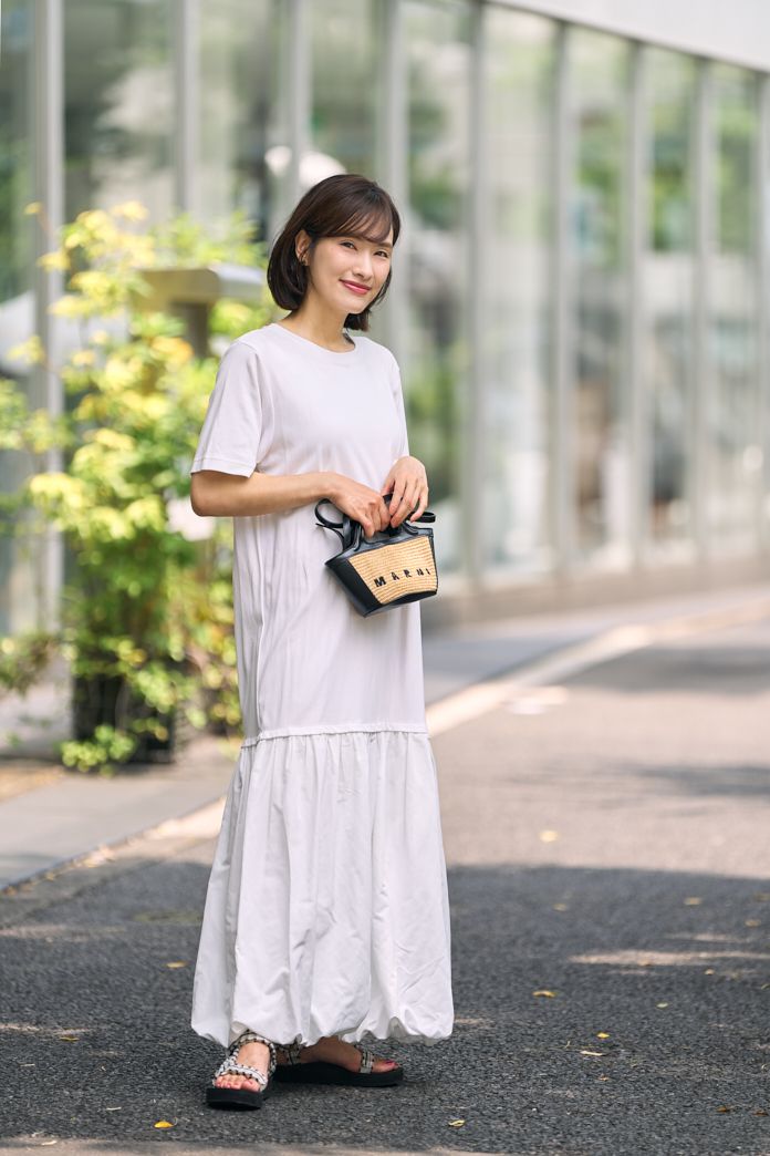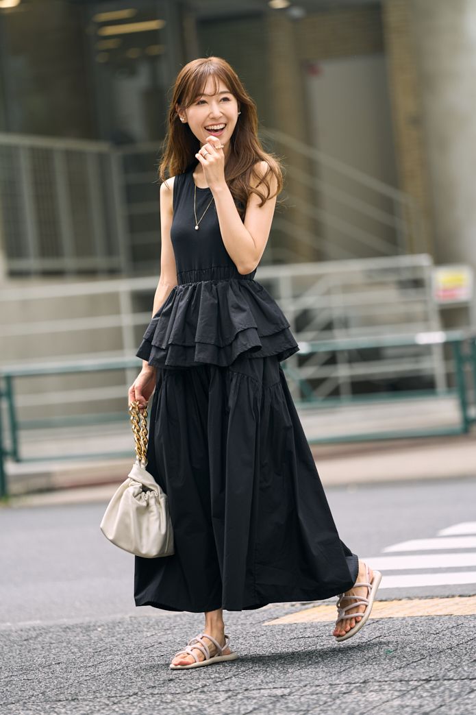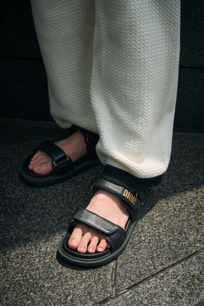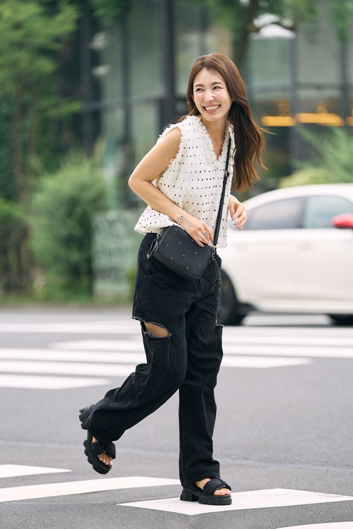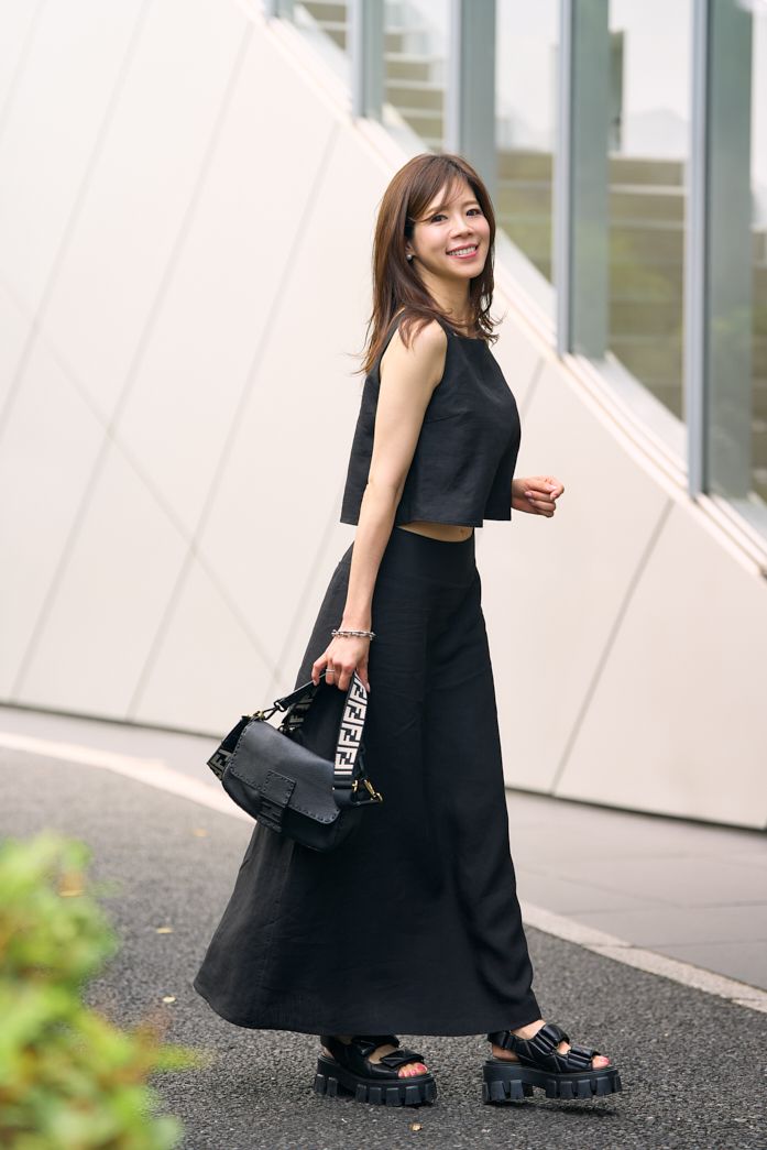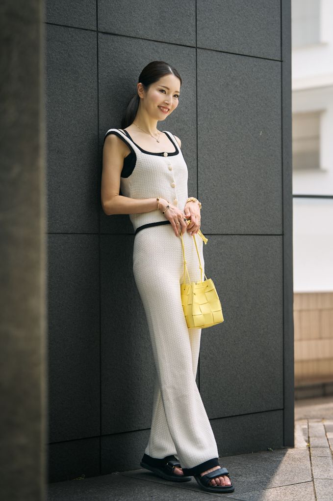 歩きやすさ抜群のフラットサンダルは、普段のお出かけはもちろん、仕事着のスクラブにも合うので大活躍。ヒールがなくても“きちんと感”をキープできるのもお気に入りのポイントです。ブラックの縁取りが効いたニット素材のセットアップは、モードで涼しげな雰囲気に。差し色にしたイエローのバッグで、夏らしい軽やかさをプラスしました。ヒールなしの日は、バッグの位置を高めに持つことで視線を上に集め、腰高見えを意識したスタイルアップテクも意識しました!