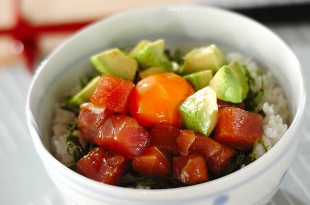 香ばしいゴマ油が食欲をそそる丼です。マグロとアボカドは相性抜群! 卵黄をとろりとからめて、まろやかな味わいを楽しんでください。見た目も華やかで満足感のある一品です。
