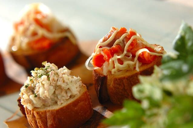 混ぜた具材をパンにのせるだけ! ツナマヨやオニオンサーモンなど、具材のバリエーションは無限大です。彩り良く盛り付ければ、見た目から食欲を誘います。