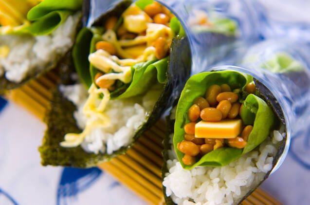納豆とチーズをのりでくるっと巻くだけで、手軽なおつまみごはんに。ツナマヨやエビなど具材を変えれば、子どもも喜ぶ、ごちそうランチに早変わり!