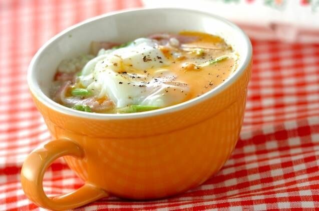 マグカップひとつでOK! 材料を混ぜてレンジで加熱するだけで、クリーミーなカルボナーラ風ごはんに。半熟卵を崩せば、とろ〜り濃厚な味わいになります。