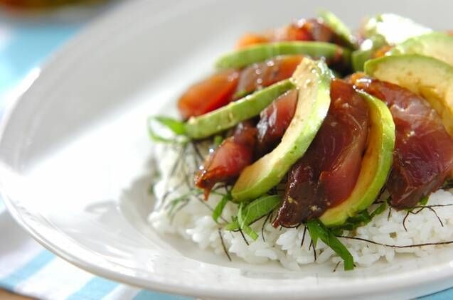手こね寿司を洋風にアレンジ。クリームチーズとアボカドを使うため、子ども好みの味わいです。カツオの代わりにマグロを使っても◎。