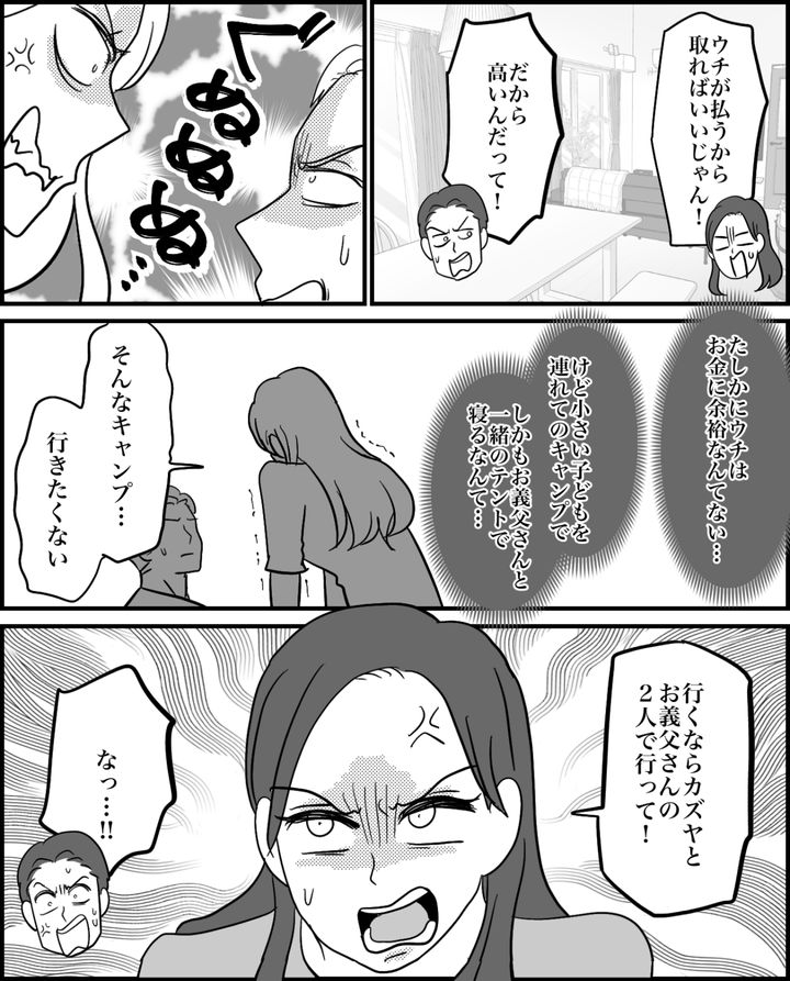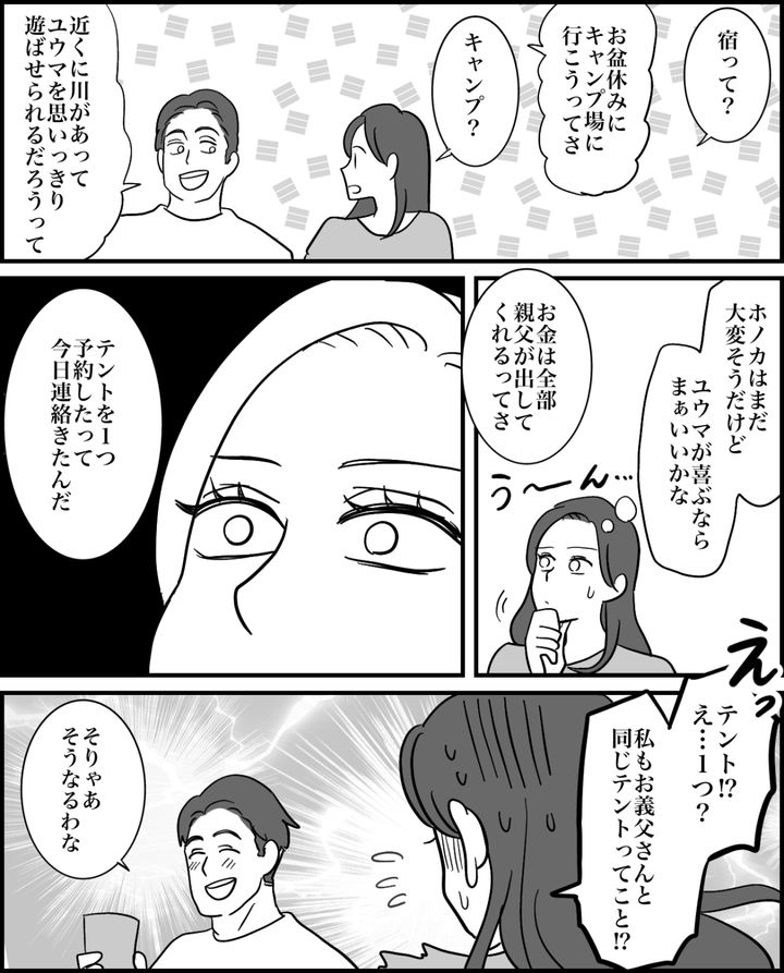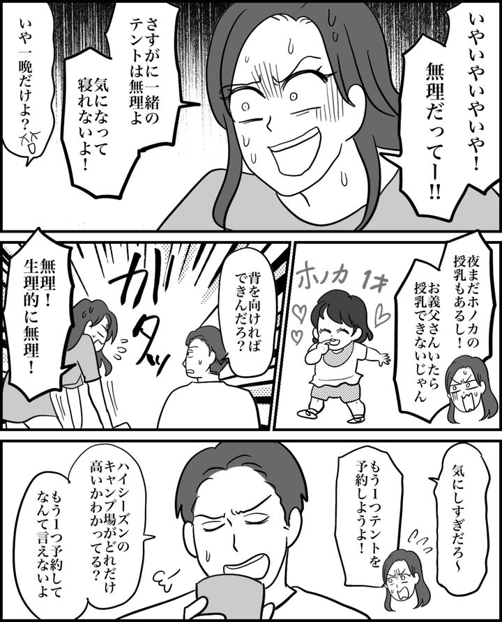 <絶対イヤ!義父と同じテント>ありえない!「同じテントで寝泊まり」授乳もあるのに【まんが】