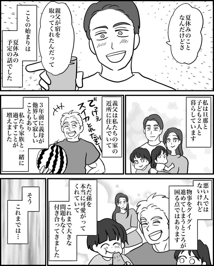 私はヒビキ(35歳)。息子ユウマ(3歳)、娘ホノカ(1歳)、そして同い年の旦那カズヤの4人家族です。私は育児に専念しほぼワンオペで子育てしてきました。3年ほど前に義母が亡くなり、近所に住む義父(65歳)は現在ひとり暮らしをしています。義父は子どもたちをとても可愛がってくれるし、これまではとくに大きな問題もなく付き合ってきました。そんなある日、お盆休みに義父と私たち家族とでキャンプへ行く話が持ち上がり……?