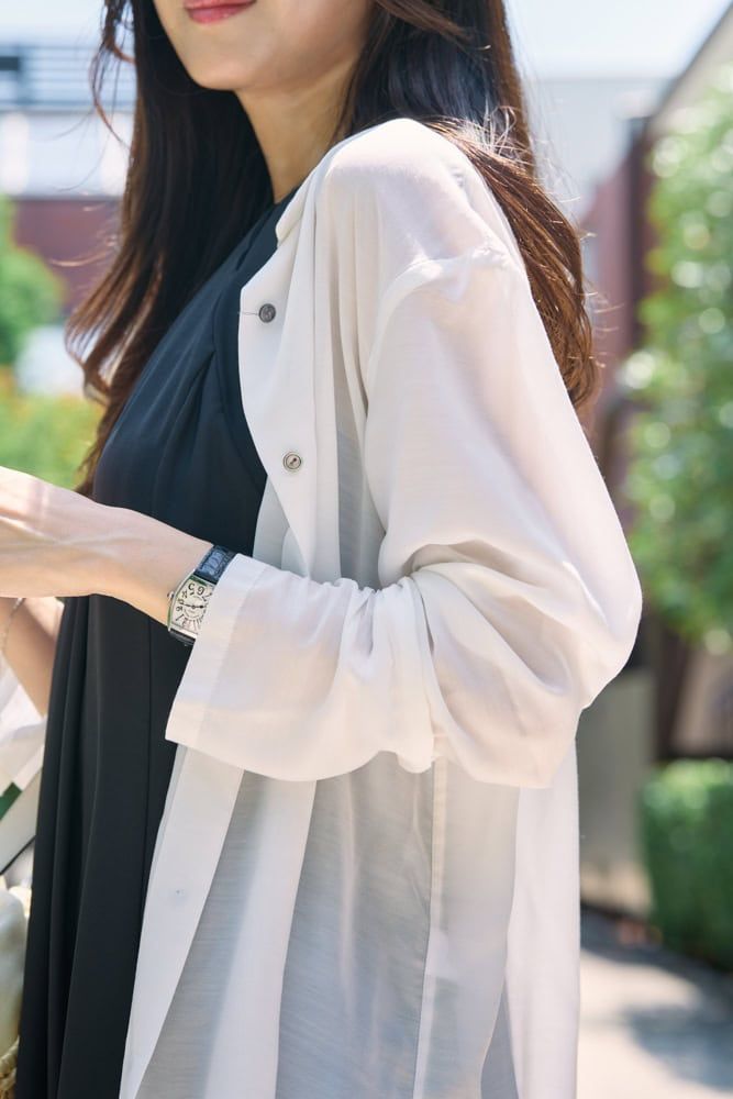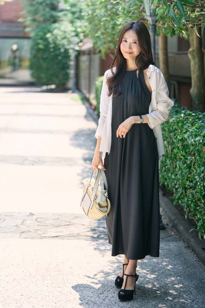 シアーシャツと黒ワンピで夏らしい女っぽコーデが完成