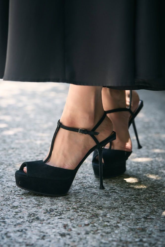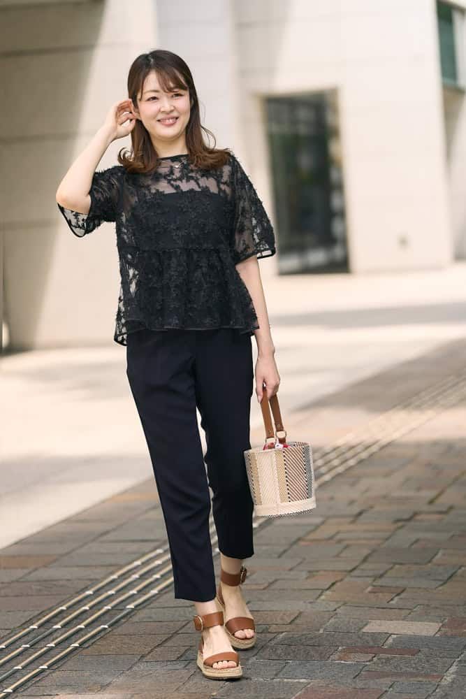 繊細なレースがかわいいシアートップスは、ブラックを選ぶことで甘くなりすぎず大人な印象に。夏らしい素材のバッグと太めのストラップで脚が綺麗に見えるサンダルはブラウンでまとめ、ほぼ黒コーデに抜け感をプラスしました。