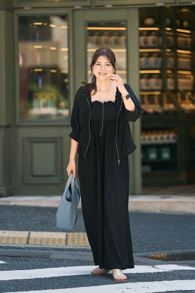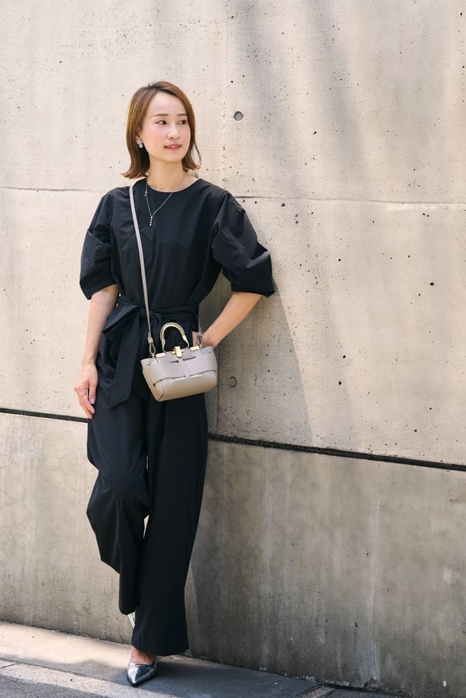 腰のリボンがスタイルアップを叶えてくれるオールインワンは、1枚でキマる優秀アイテム。全身黒なので、ZANCHETTIのバッグとシルバーのパンプスをアクセントにしました。オールインワンだと子供を連れた新幹線移動も楽ちんで、黒は汚れも気にならないので帰省時にも重宝。実家の家族や地元の友人とのランチなど、どんなシーンでも活躍します。