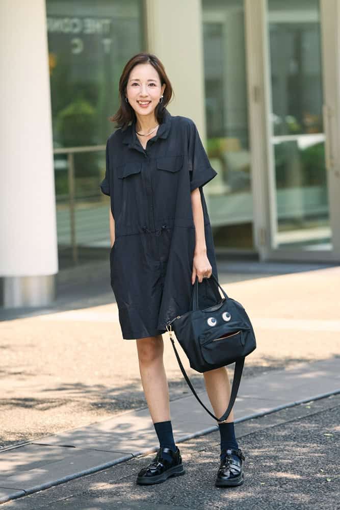 身幅はたっぷりゆとりがあるけれど丈は短めでコンパクト、そのバランスが気に入っています。座りっぱなしでもシワになりにくく軽くてストレスフリーな着心地なので、長距離移動に欠かせない1枚です。オールブラックのコーデが重くならないように、オールインワンと同じナイロン素材のバッグをチョイス。ボリュームのあるグルカサンダルにネイビーのラメソックスを合わせ、肌見せ分量を調整しました。