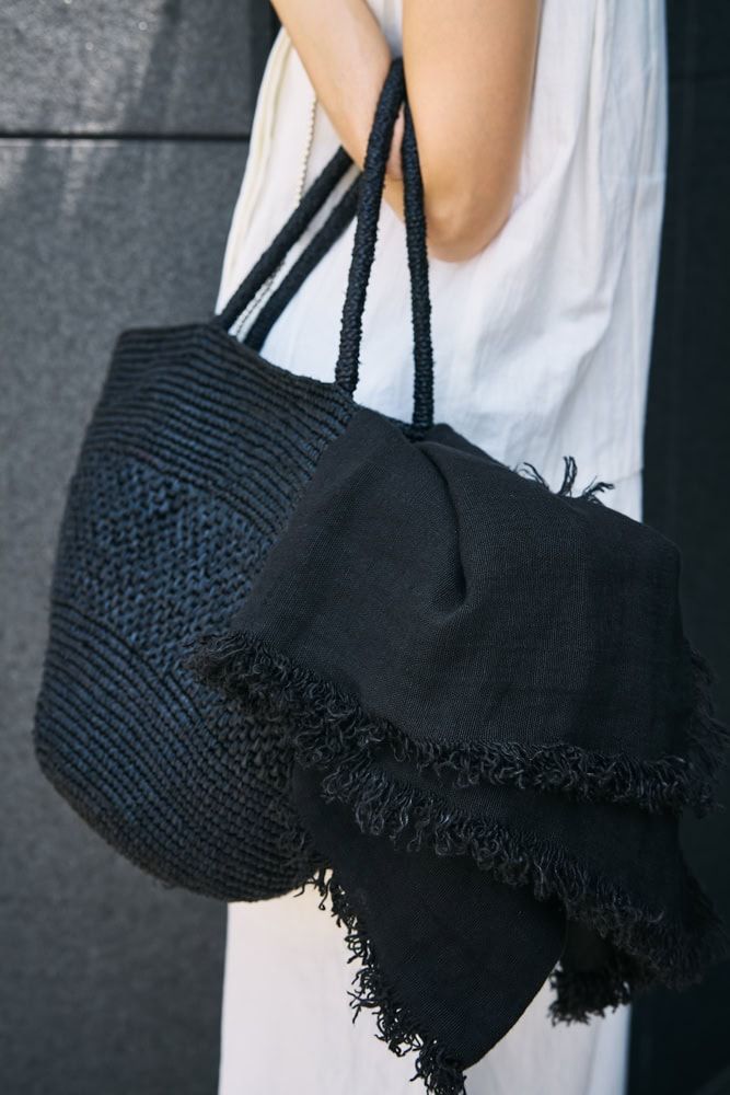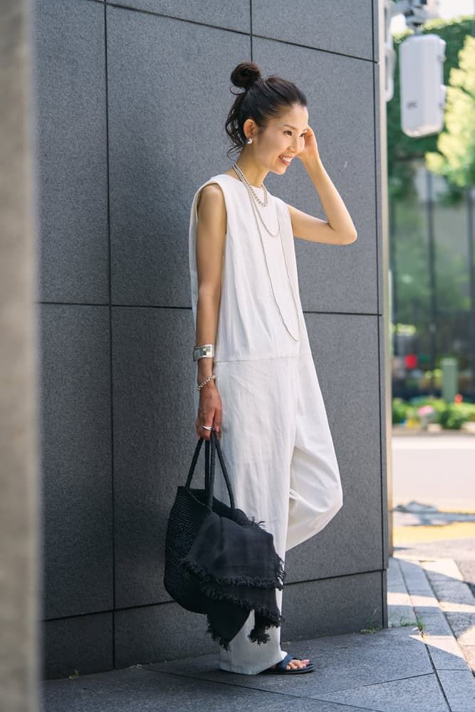 涼しくて動きやすいオールインワンは帰省や旅行に欠かせないアイテム。こちらのHER.のオールインワンはリネン混の素材感とゆとりのあるボックスシルエットが秀逸で、すとんと着るだけでリラクシーな雰囲気に仕上がるのでつい手に取ってしまう頼れる1枚です。のっぺり見えないようジュエリーを重ねてポイントを。かごバッグとリネンストールは黒で統一し、ほっこりさせずにモダンな印象を目指しました。
