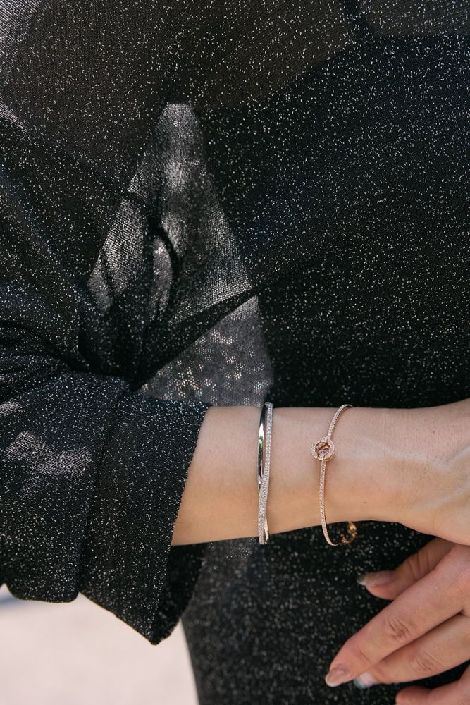 ゆったりとしたシルエットでシアー感が際立つラメニットはカジュアルなデニムスタイルを一気に華やかにしてくれる優秀アイテム。袖が長めにデザインされていて、捲ったときの絶妙なたるみ感が女性らしさを演出してくれます。お気に入りのスワロフスキーのブレスを追加し女子会へGO!