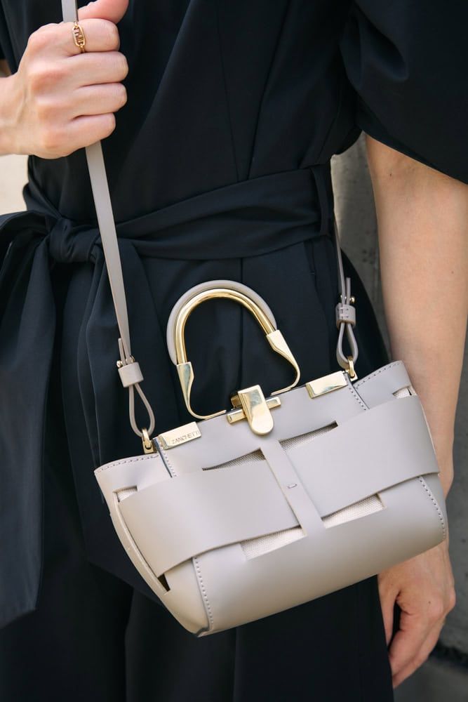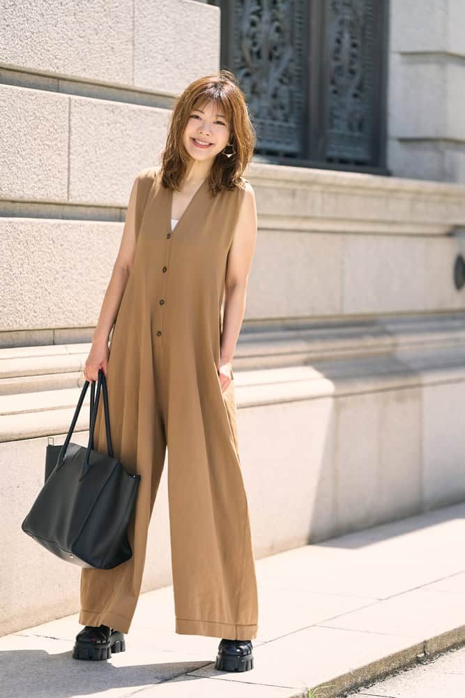 オールインワンは動きやすく楽なので、暑い季節に1番出番が多いアイテムです。こちらのetre tokyoのオールインワンはニット素材で伸びが良いので、リラックスできて移動にもピッタリ。ボリュームのある靴で明るい色のコーデを引き締め、黒レザーの大きめバッグできちんと感をプラスしました。星の形がキャッチーなゴールドのピアスはPRADAで見つけたもの。コーデに華やかなアクセントをプラスできます。