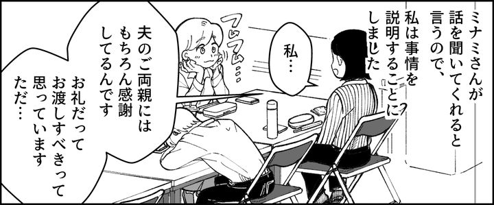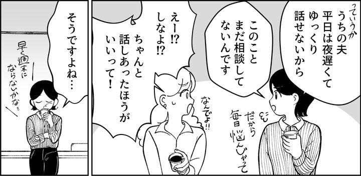 職場の先輩ミナミさんに相談をすると私の気持ちをわかってくれたようで、まずは夫と話すべきだとアドバイスをくれました。