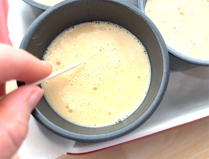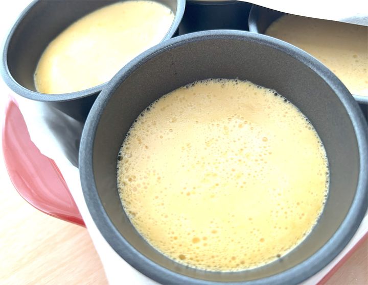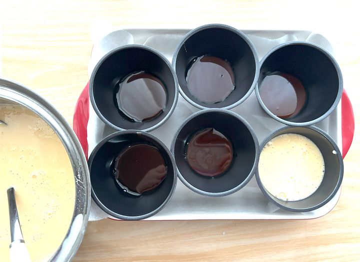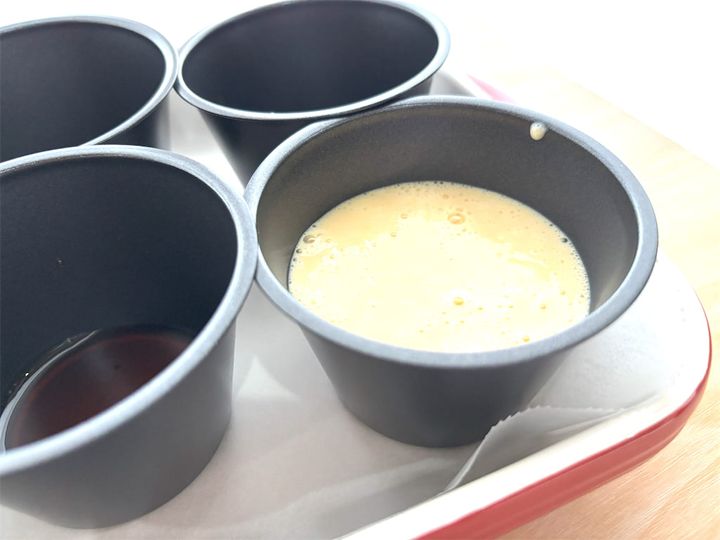 1のカラメルソースが入った型に、2のプリン液を型の8分目くらいまで注ぎ入れます。