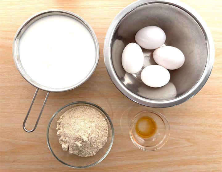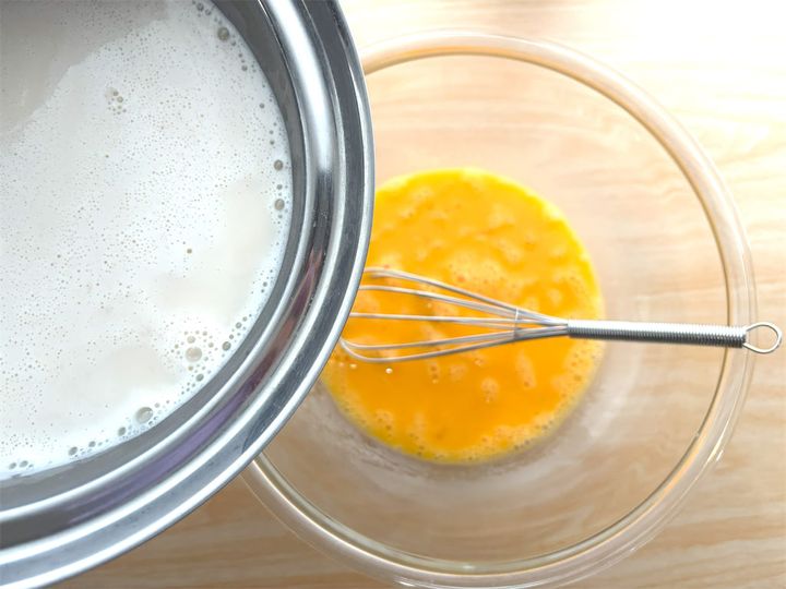 温めた牛乳を、ボウルに少しずつ加えて卵液と混ぜ合わせます。