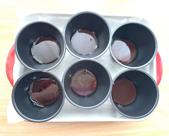 出来上がったカラメルソースは、熱いうちにプリン型へ流し入れておきましょう。