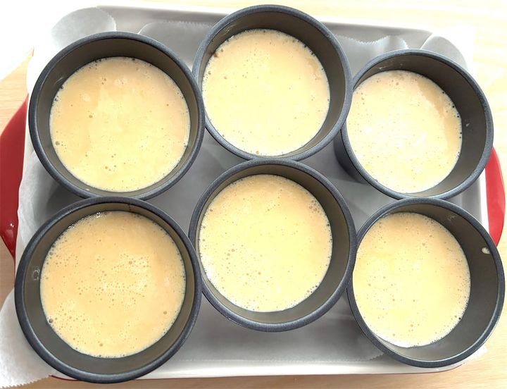 プリン型が並べられた耐熱皿の中へお湯(70℃くらい)を注ぎ入れます。