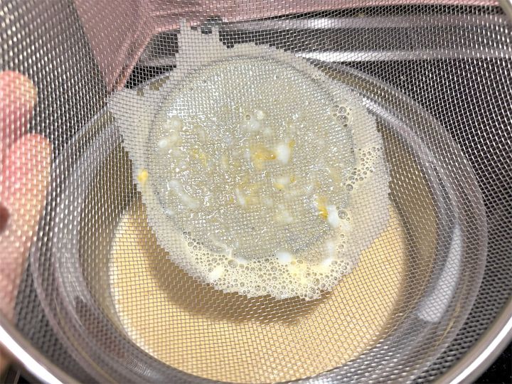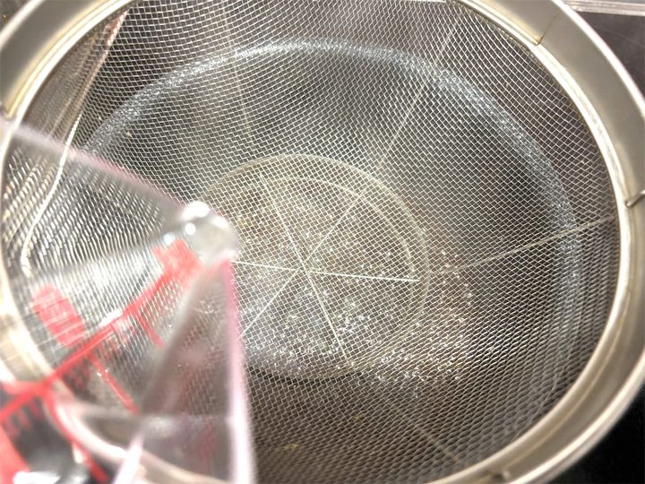 鍋の上にザルを乗せてから、分量の残りの水30mlを加えます。