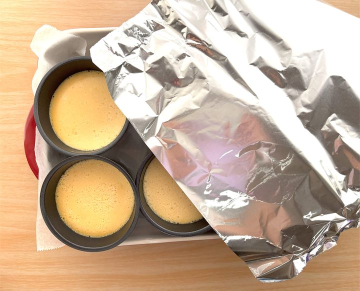 焼けたプリンは、アルミホイルをかぶせたまま常温で完全に火を通し、粗熱を取ってから、冷蔵庫で8時間以上冷やしたら完成です!