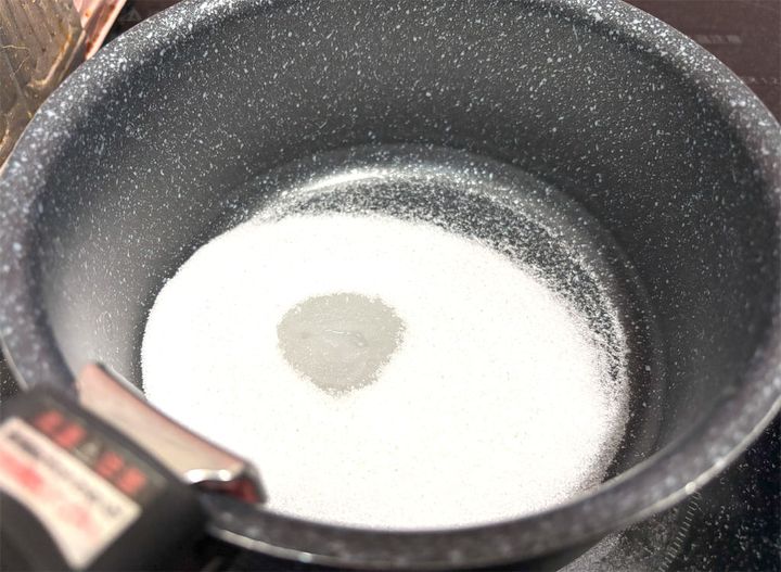 鍋にグラニュー糖を入れて、そこへ小さじ1杯分の水を加えてから、点火します。