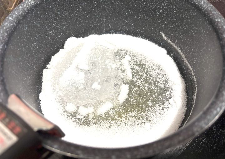 鍋をゆすってグラニュー糖を全体になじませていくと、下の画像のように徐々にグラニュー糖が溶けていきます。
