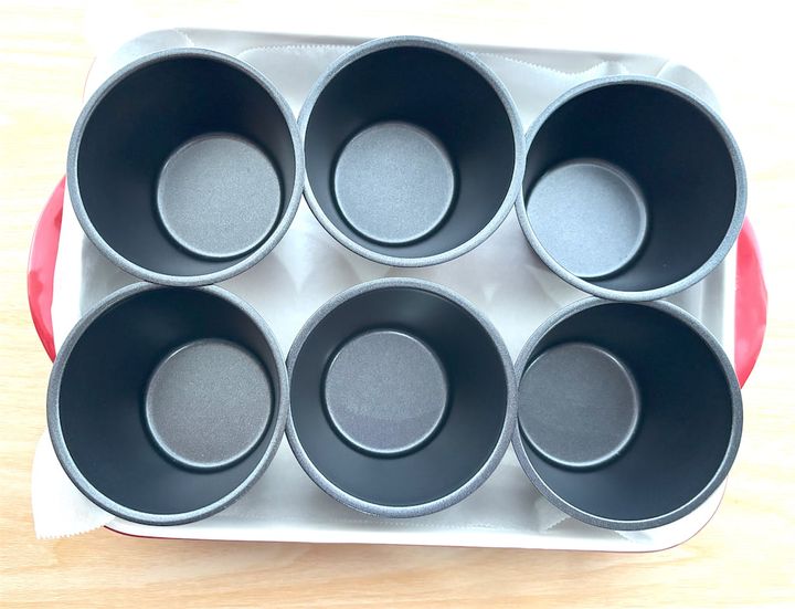 耐熱の皿などにクッキングシートを敷き、その上に油を塗ったプリン型を並べておきます。
