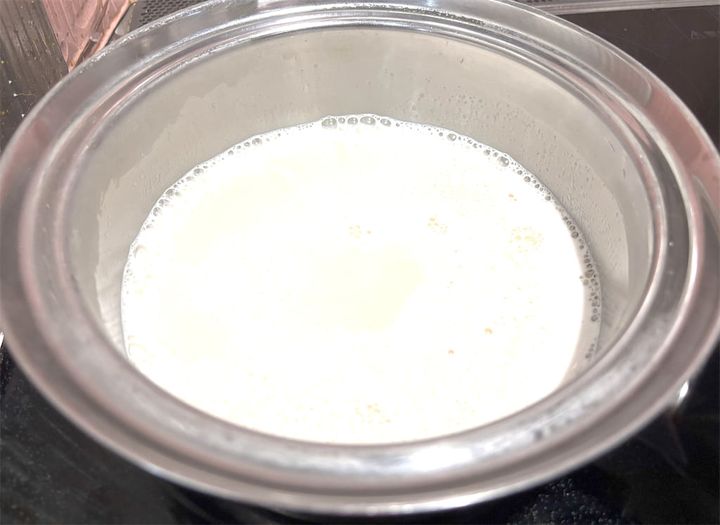 鍋に牛乳と砂糖を加えて、強火(IHクッキングヒーターだと160℃以上)で沸騰直前まで温めます。
