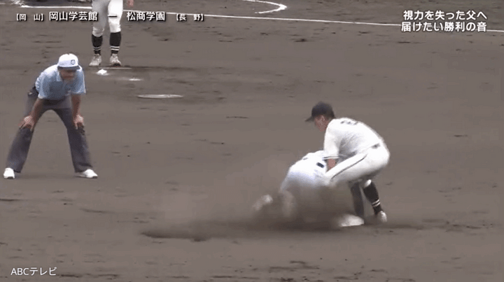 目が不自由な父親から音を通して指導されるのが、明樂選手の幼い頃の日課だった。そんな明樂選手は、「甲子園で勝ってお父さんに勝利を届けたい」という思いで、松商学園(長野)戦へ。気合十分の初打席は、残念ながらショートゴロだったが、勝利への思いがあまりにも強かったのか、ボールはショートのグローブをはじき、明樂選手は出塁した!