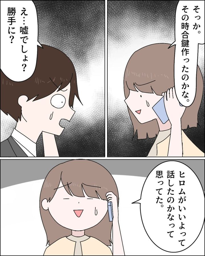 「そっか。その時合鍵作ったのかな。」と私が言うと、ヒロムは「え・・・嘘でしょ?勝手に?」と本当に驚いた様子でした。「ヒロムがいいよって話したのかなって思ってた。」と言いつつ、ヒロムがOKしながらも私に黙っていたのではないと確認できた私は少しだけホッとしていました。