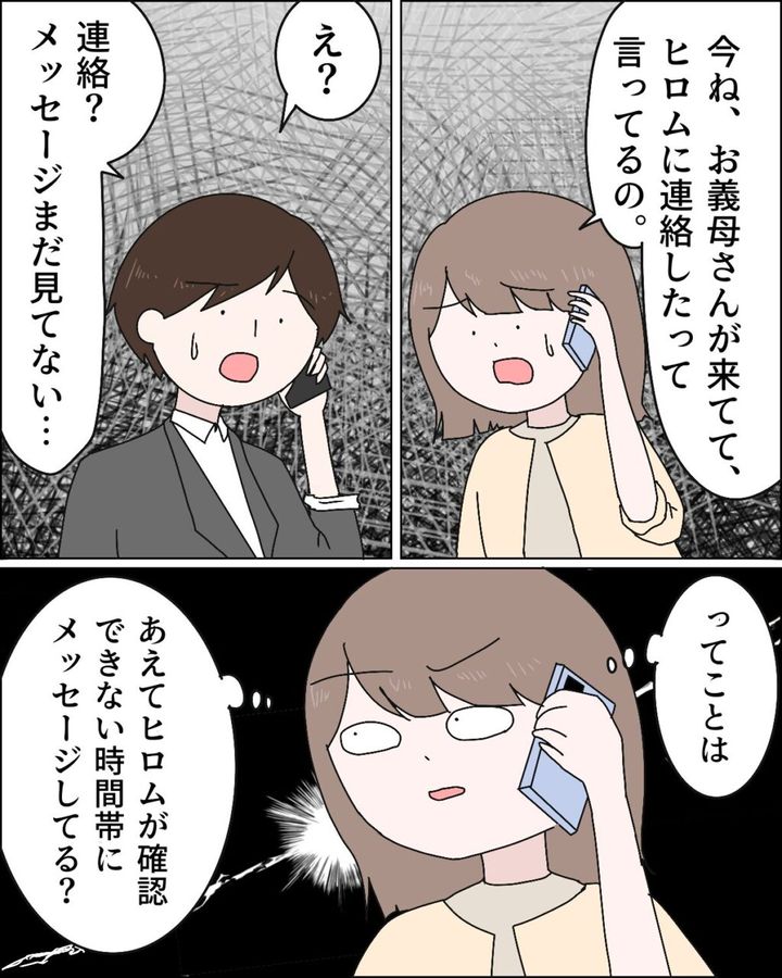 誘ってもいないのにウチで夕飯を食べて行く気でいる義母の勝手な要望で、夕飯に予定していたパスタが変更になってしまったため、私は義母のためのお惣菜を買いに行く口実でヒナと一緒に外に出ました。即行でヒロムに電話すると、「今ね、お義母さんが来てて、ヒロムに連絡したって言ってるの。」と伝えました。仕事を終えたばかりの様子のヒロムは、「え?連絡?まだメッセージ見てない」と言うので、私は義母があえてヒロムが確認できない時間帯にメッセージしてる?と推測しました。