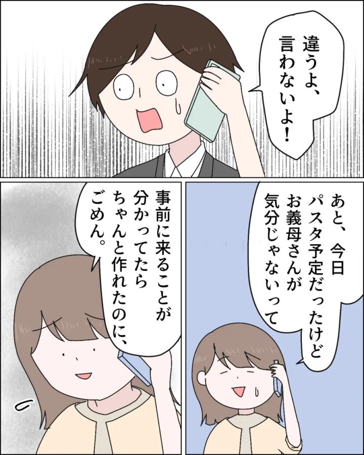「あと、今日パスタ予定だったけどお義母さんが気分じゃないって。事前に来ることが分かってたらちゃんと作れたのに、ごめん。」と、義母も夕飯を食べていくことも伝えました。