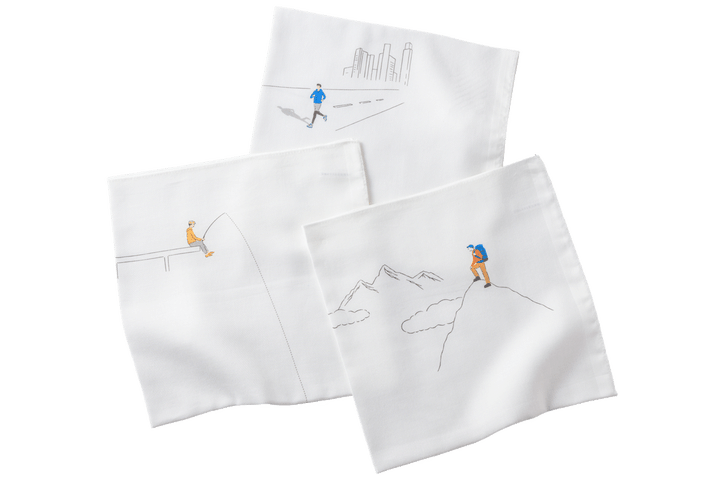 1879年創業の〈ブルーミング中西〉から生まれたハンカチーフ専門店が提案する、HOBBYシリーズ。綿100%の生地にプリントされた、釣りやランニング、登山など、趣味をモチーフにした絵柄は、まるでキャンバスに描かれた一枚の絵のよう。縁は朱子織に、中地は綾織を用いて、スタイリッシュに仕上げられている。