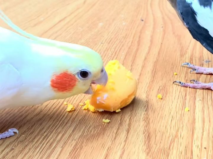 3. 「食べ過ぎだって!」ごはん大好きな相棒を、やんわり注意する可愛いオカメインコさん