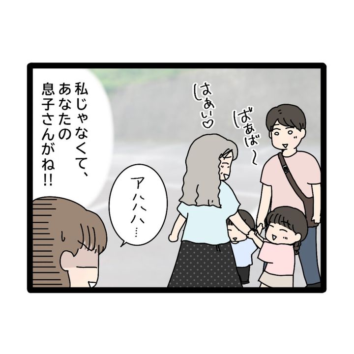 「はあば~」「はぁい」と楽しそうなやりとりをする義母の背中に向かって、「アハハハ・・私じゃなくて、あなたの息子さんがね!!」と心の中で呟いたのでした。