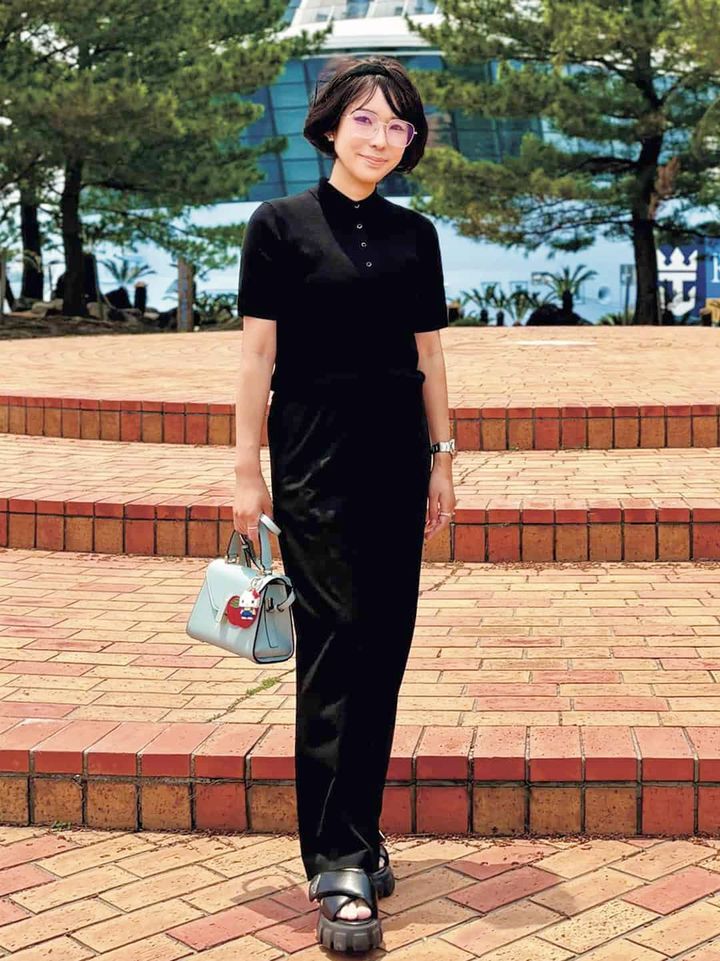 サンダルは、プラダのモノリス。トレンドのポロシャツは、ニット素材ならカジュアルになりすぎず着られるのが気に入って購入しました。ボタンはすべて留めて、今年らしいメタルフレームのアクセサリーで、オールブラックコーデにアクセントを。