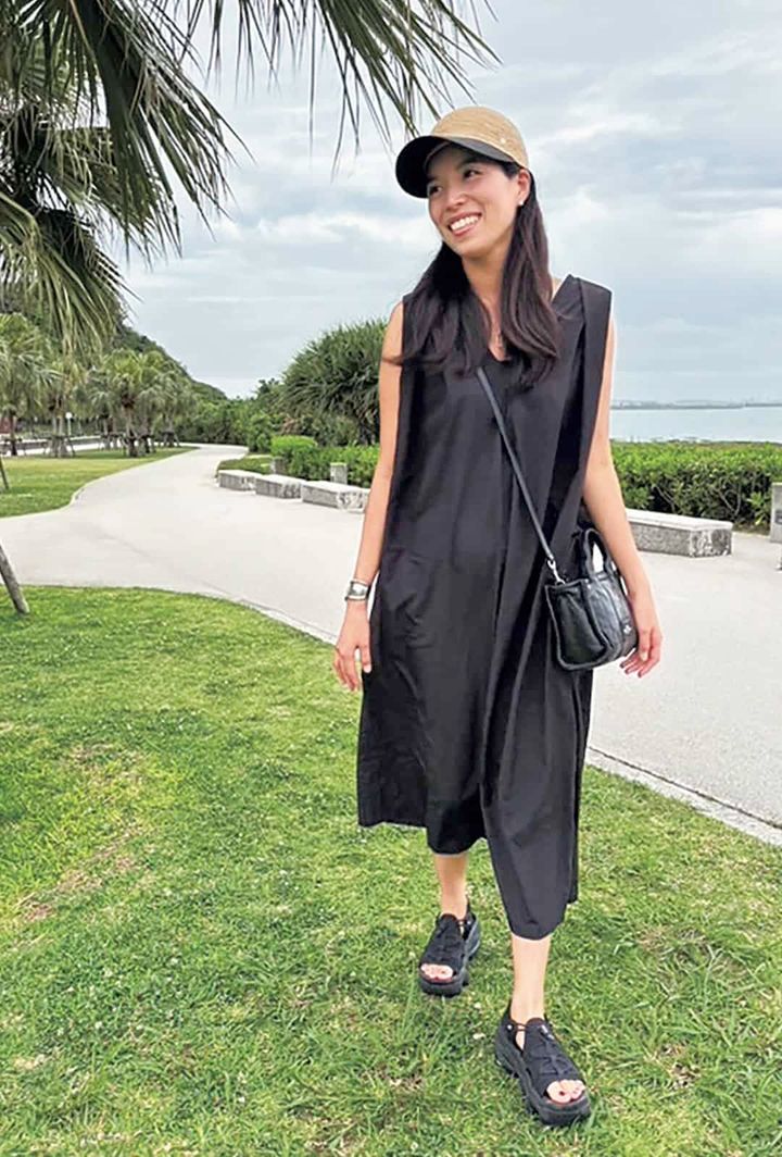 スポサンは、ナイキのエア マックス ココ。サラッと着れて一枚で完成するブラックワンピはテントラインの足捌きがよく、風を通しやすいので◎。キャップは、ラフィア素材が涼やかに見せてくれます。
