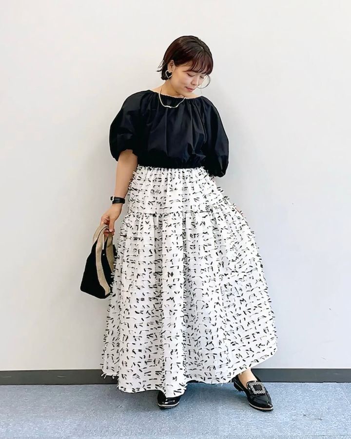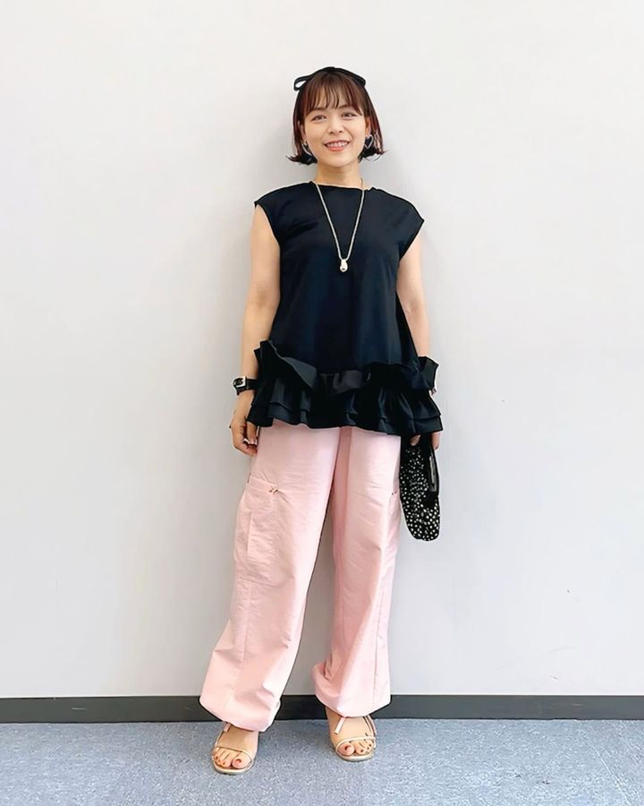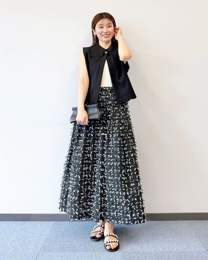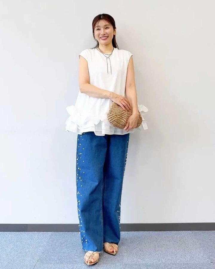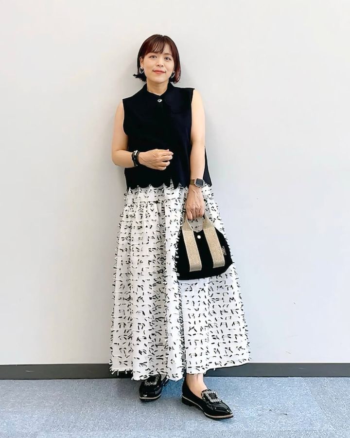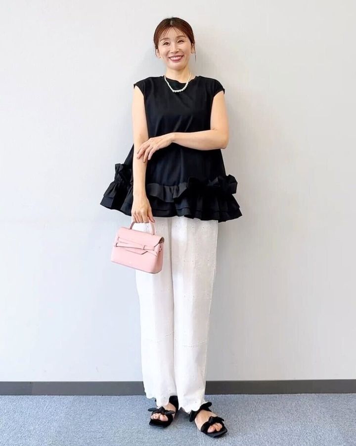 3. 暑さに負けず“きれいめ感”キープ!「華やか服」が40代のワンツーコーデを救う【身長別コーデ】