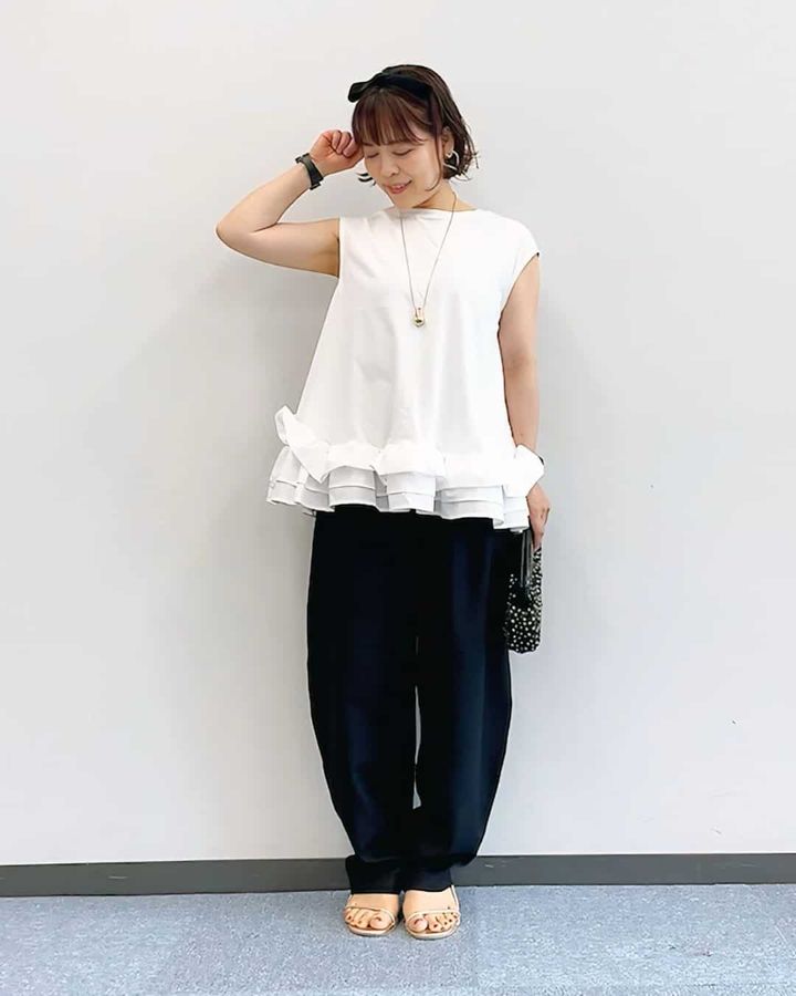 暑くてコーデを考えるのが面倒な朝におすすめのワンツーコーデが華やかに決まるトップス。裾はフリルで華やかですが、顔周りはシンプルなカットソーなので、甘め苦手な方もチャレンジしやすいデザインです。腰回りのボリュームをさりげなくカバーしてくれるのも嬉しいポイント♪