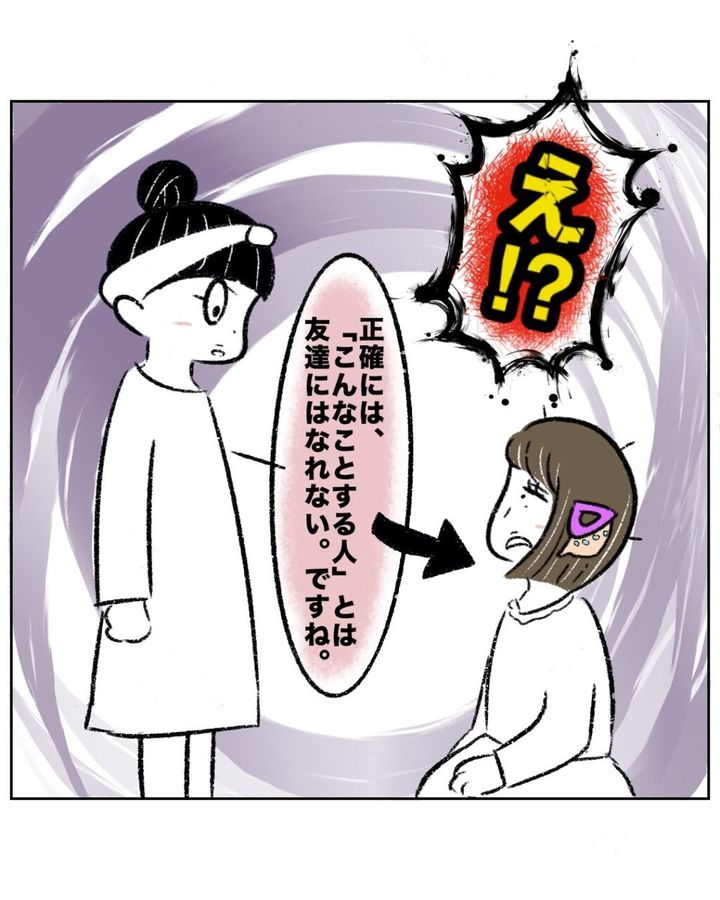 「え!?」まるさんにそう言われて愕然とするゆかちゃんママに、「正確には、『こんなことする人』とは友達にはなれない。ですね」と思っていることを正しく伝えるまるさん。