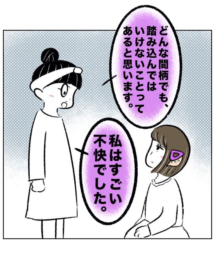 まるさんは、「どんな間柄でも、踏み込んではいけないことってあると思います。私はすごい不快でした」しっかりゆかちゃんママの目を見て言いました。