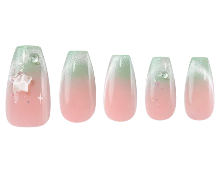 青草の香りと甘い果実、輝く日差しを感じさせる夏っぽネイル。プレイフルなスターパーツがおかわ。