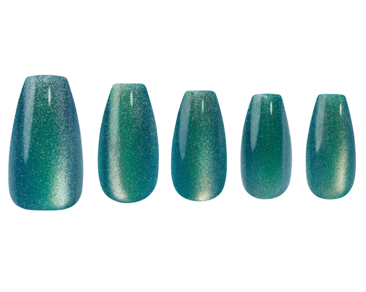 ネイビー、ブルー、グリーンが絶妙に混ざり合った深い海の清涼感を閉じ込めた水光ネイル。穏やかな海を感じる深みカラー。