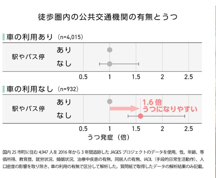 その結果、車を利用していない高齢者で駅やバス停が近くにないと感じている人は、あると感じている人に比べて、3年後に1.6倍もうつを発症しやすいことが明らかになりました。