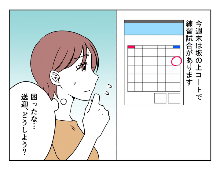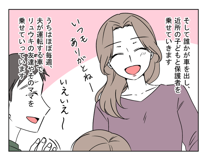 習い事の送迎は、子どもだけでなくママも乗せていくことが多いそうです。 マイさんの旦那さんは、リュウキくんがサッカーを習う前から3列シートの車を所有。大きな車なので、乗せる人数にも余裕があるそうです。マイさんの旦那さんも送迎役を進んでやってくれる性格なので、運転が苦手なマイさんも助かっていました。 しかしその旦那さんがしばらく仕事で不在になってしまい、送迎役がいなくなってしまったことで悩むマイさんなのでした。