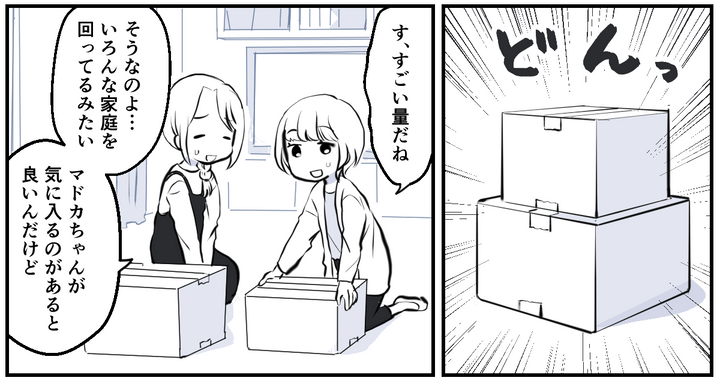 こうしてその日の午後、私は段ボールを持ってマドカちゃんの家に行きました。マドカちゃんはその場で段ボールを開けると、さっそく仕分けをはじめました。