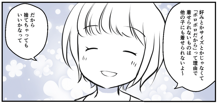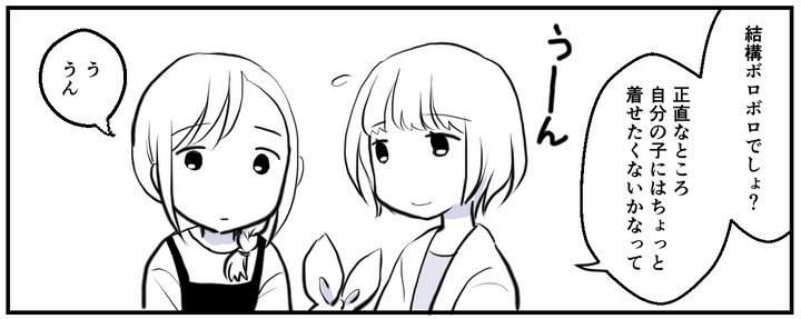 だからこそマドカちゃんが、「これはわが子には着せたくない=もう着られない」と明確な理由で判断したのは、私にとっては目からウロコでした。