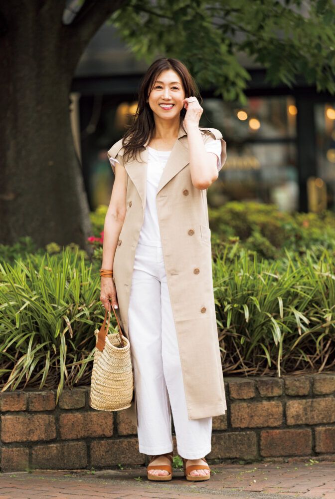 装いの主役は「ワンピースにもなるので便利」と話す「ジーナシス」のトレンチジレ。季節を問わず楽しめるマルチな1着です。白と茶系でまとめて統一感を出し、夏小物で程よい抜け感とリラックス感を演出。Tシャツは「アレキサンダーワン」、パンツは「ギャルリー・ビー」。