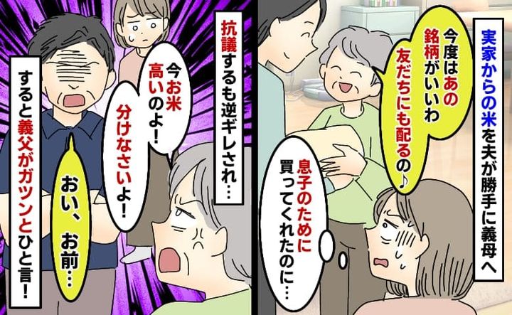 息子のためのお米を義母が横取り「お友だちに配るの♪」はぁ!?抗議すると逆ギレ…すると義父がひと言