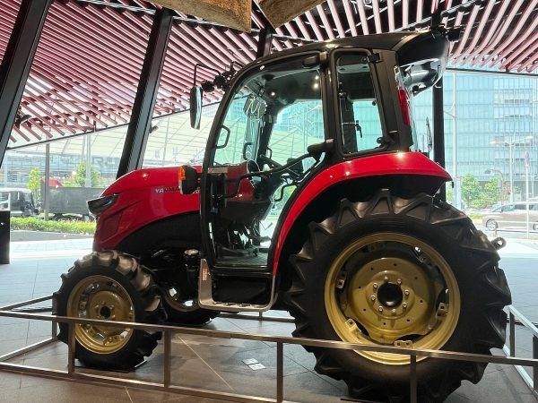 カフェの近くには、座って休憩できるテーブルとイスも。そして、その前には、どんっと、ヤンマーの農耕用機械が(笑)。なかなか、斬新なレイアウトです。