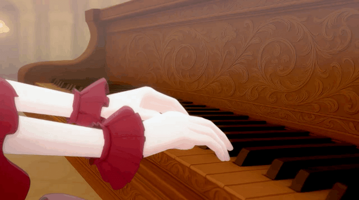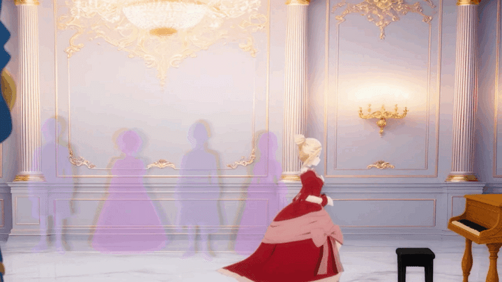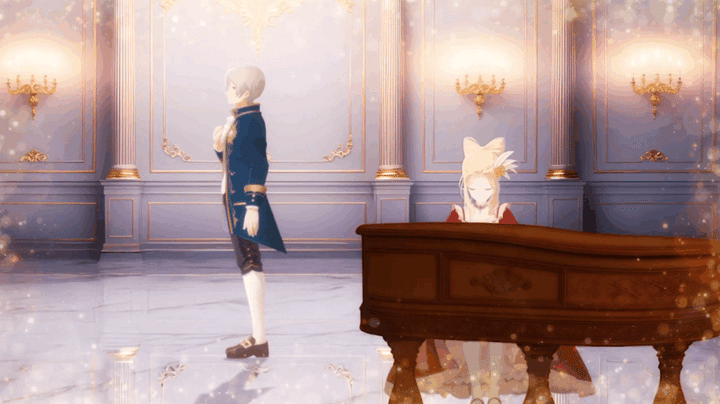 周囲の貴族たちが「変わった贈り物ね…」「ウィーン流ですって」と囁くなか、マリー(CV:ファイルーズあい)は伴奏を務めるためピアノの前へ歩み出る。
